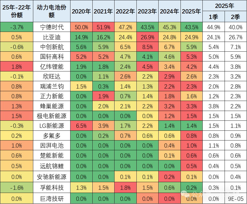 电池企业的竞争格局形成宁德时代和比亚迪两者相对较强的特征。宁德时代的2025年2季度占比下降到40%,比亚迪的占比从2020年的15%上升到2025年2季度的26.7%;其它电池企业的占比也出现了明显分化的态势。电池企业形成了头部企业聚集效应放缓的特征,从2022年的头两家企业72%的比例,到2025年仍保持67%的比例,其它企业的空间有超30%左右的空间。