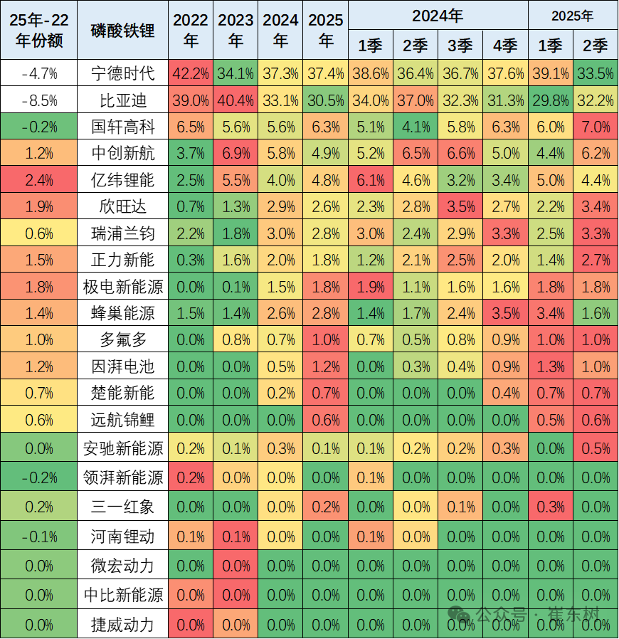 电池企业的竞争格局形成宁德时代和比亚迪两者相对较强的特征。宁德时代的磷酸铁锂电池的占比份额从2024年已经反超比亚迪。2025年2季度比亚迪开始发力恢复,但份额较同期仍下降4.8个百分点。亿纬锂能(维权)和中创新航表现较强。欣旺达、瑞浦兰钧、蜂巢能源、极电新能源的提升明显。由于比亚迪全面转型磷酸铁锂电池,因此宁德时代、LG、蜂巢等前三家的三元电池优势更加明显,近期巨湾技研、亿纬锂能表现较好。
