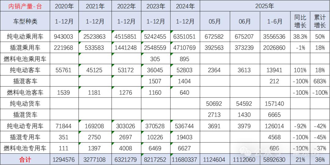 2025年6月的新能源汽车合格证产品产量是111万台、同比增21%。2025年1-6月新能源车国内合格证589万台、同比增36%较强,其中纯电动乘用356万台、同比增50%;插混乘用车203万台、同比增18%;纯电动专用车和货车28万台,这样的产量数据还是较好的。