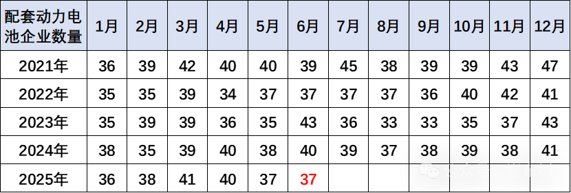 过去几年,电池市场的竞争格局并没有发生明显的变化,2025年6月配套电池企业是达到37家的中低位。由于动力电池市场的技术进步相对比较缓慢,而规模增长特征相对明显,因此,电池企业获得了较强的生产和装车数量增长的特征。