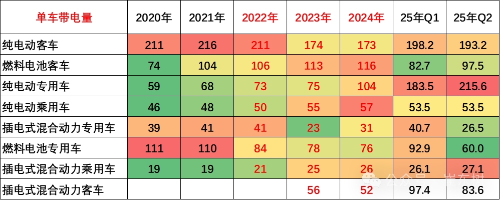 2025年2季度的电池能量密度160以上的车型占比6%,相对于2024年的13%出现了明显的下降,这主要还是磷酸铁锂电池对三元替代带来的能量密度下降。而125以下的能量密度的产品2025年下降到了1%的比例。