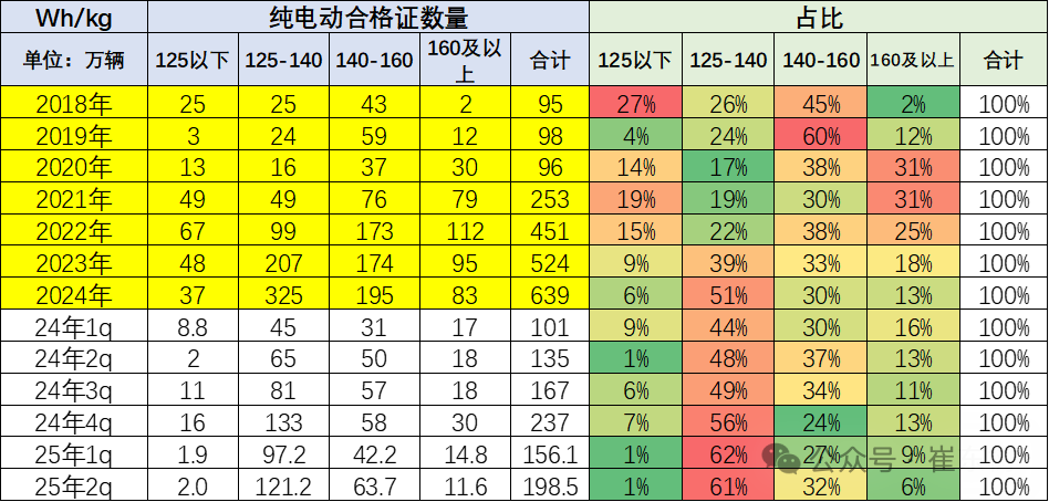 纯电动车目前主力电池能量密度区间在125到160之间。尤其2025年2季度表现比较突出的是125到140的电池占比达到61%,同比上升13个百分点。