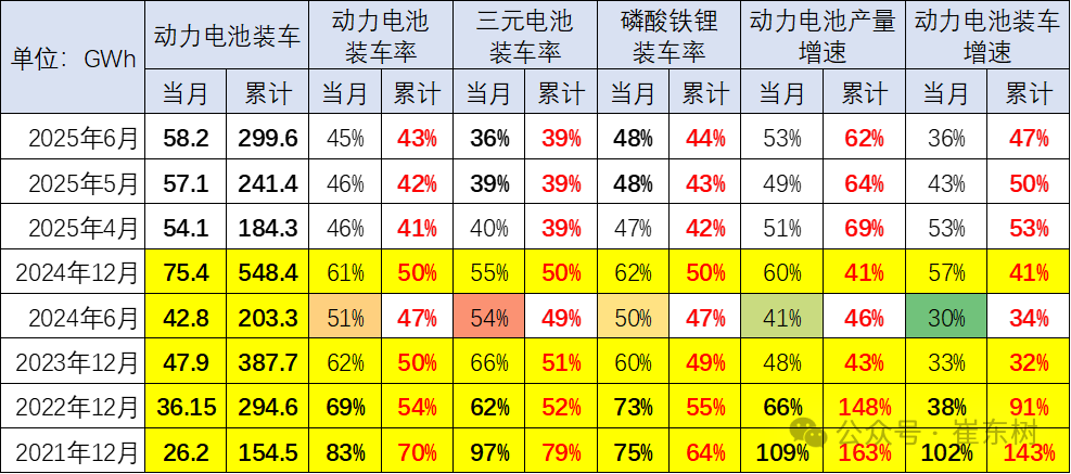 随着储能等产业的发展,尤其是俄乌危机带来的世界能源危机,储能等产业的电池需求增长很快,导致装车的电池占比下降较明显,但年初的市场回落带来占比的下降。动力电池和储能电池都是生产过剩和库存相对表现压力较大的。2021年和2022年动力电池的增速低于整车增速,2023年和2024年的动力电池装车偏低,电池产量持平于装车增速。2025年的电池生产较多,装车起步较低,6月装车率保持近期高位。