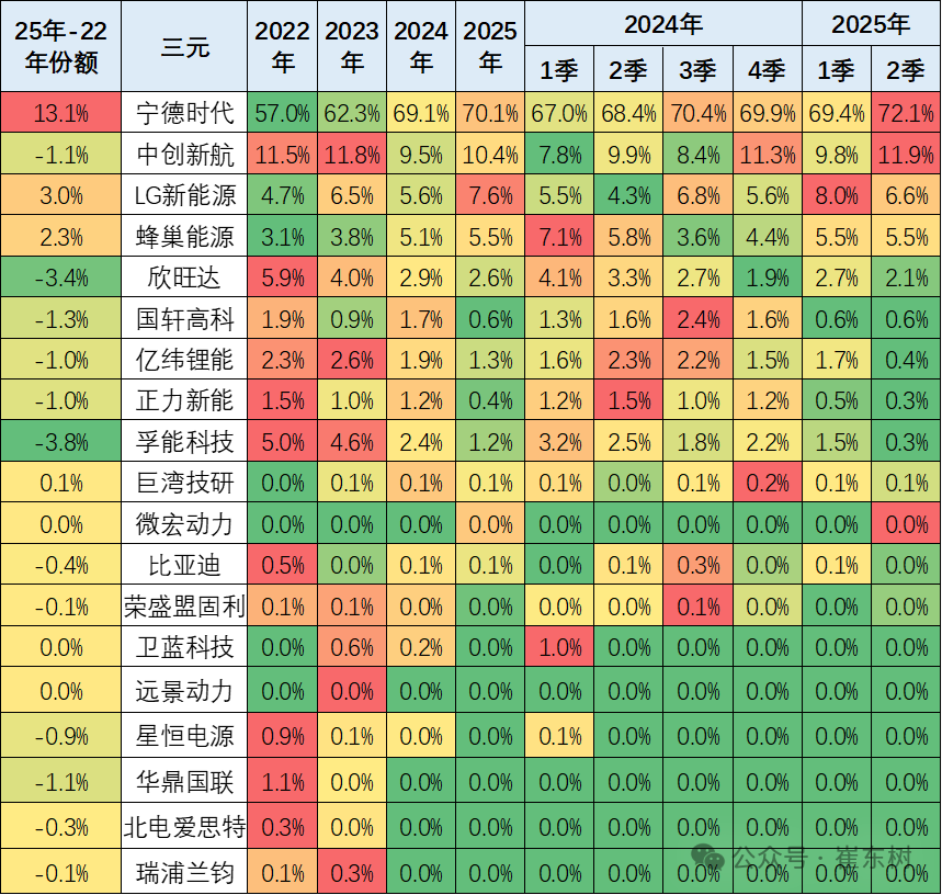磷酸铁锂电池的产品差异优势明显。比亚迪相对优秀,但今年年初处于调整期。宁德时代的磷酸铁锂电池的占比份额从2024年已经反超比亚迪。2025年2季度比亚迪开始发力恢复,份额较同期下降4.8个百分点。亿纬锂能和中创新航表现较强。欣旺达、瑞浦兰钧、蜂巢能源、极电新能源的提升明显。