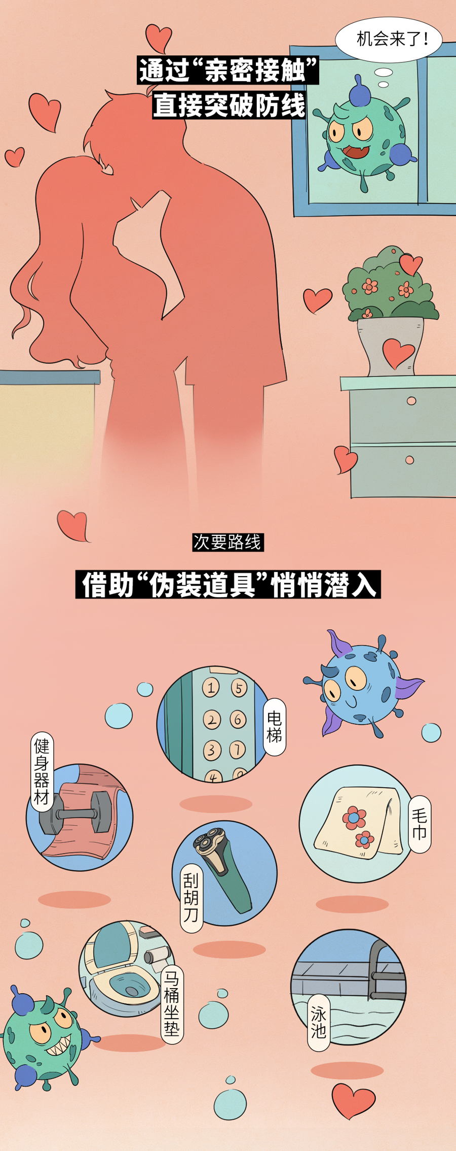 为了延续生命,它必须寻找一切机会入侵人体,主要通过亲密接触传播,也可借助公共物品通过皮肤微小裂痕潜入。
